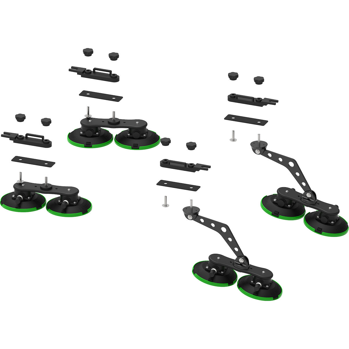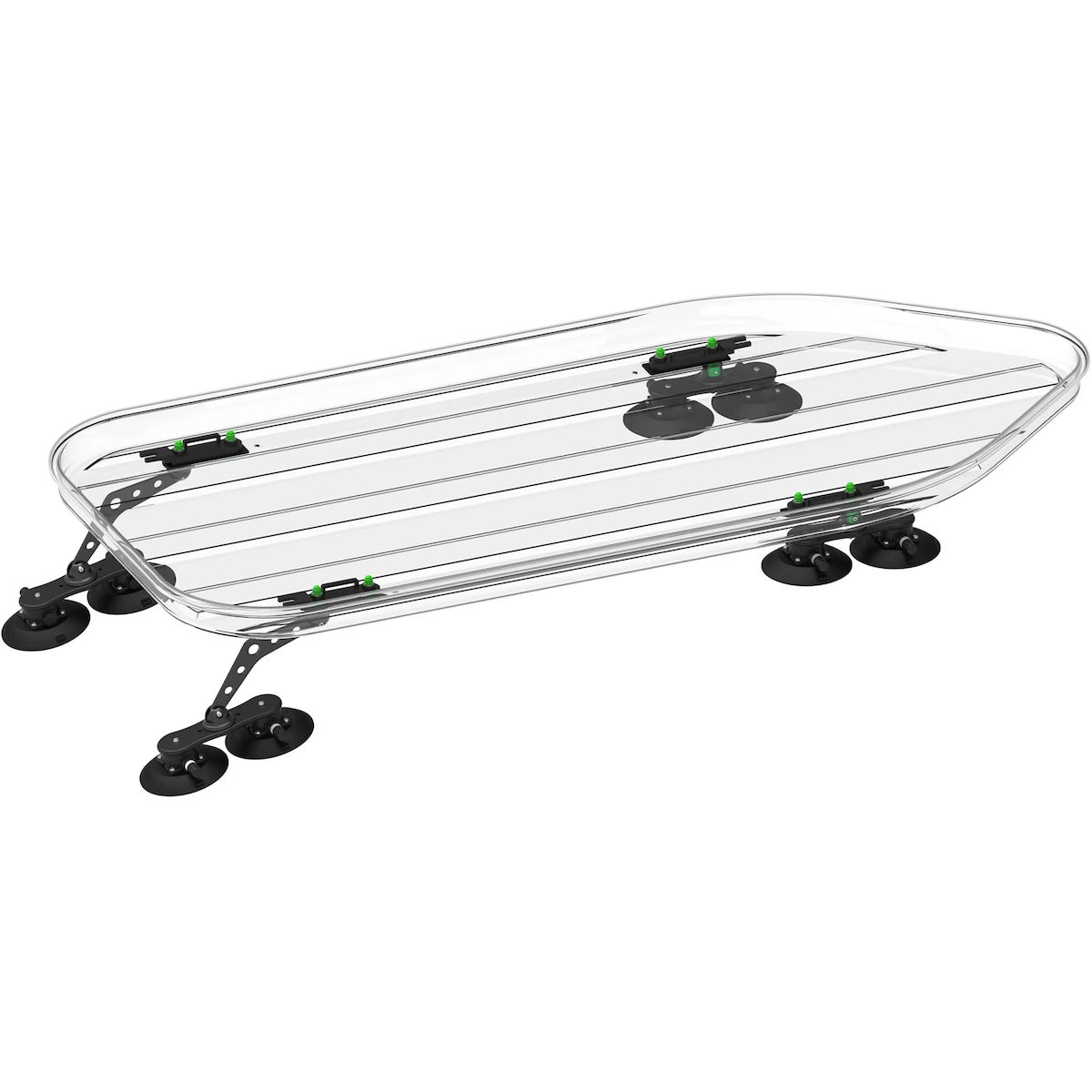 - Befestigung vorne: 2 x 2 Saugnäpfe. Die Saugnapfaufnahmen in Verbund mit einem CNC-gefrästen Gelenk ermöglichen eine perfekte Ausrichtung der Dachbox auf verschiedenen Fahrzeugdächern.