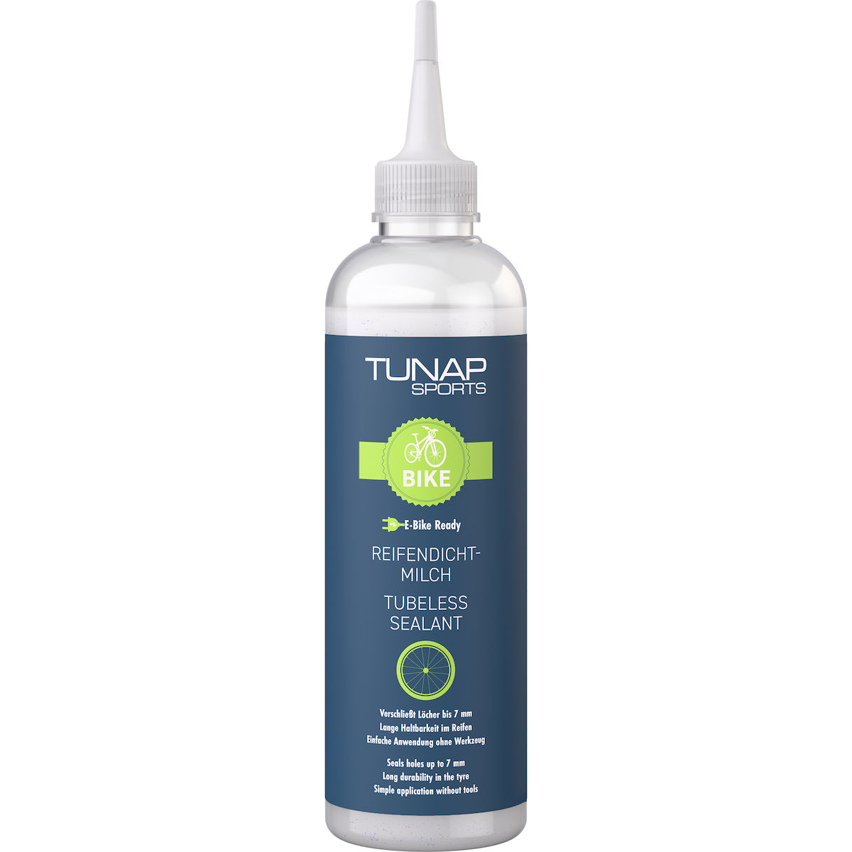 Die TUNAP SPORTS Reifendichtmilch lässt sich ohne Werkzeug direkt über das Ventil einfüllen. Einmal angewendet bleibt sie bis zu 12 Monate lang flüssig und bietet zuverlässigen Schutz. Und das Beste: Unsere Dichtmilch greift weder Reifen noch Felgen an, ist geruchsneutral und eignet sich für alle Tubeless-Systeme an Mountainbikes, Gravel-Bikes und Rennrädern.