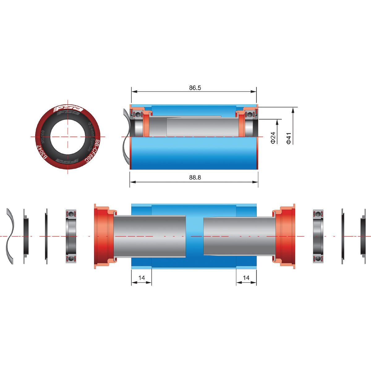 CFM92/SLE/CZ, mit Edelstahllagern, nur für Kurbelgarnituren ohne Klemmschraube am linken Kurbelarm (NBD), Rahmendurchmesser 41 mm, Rahmenbreite 91,5 mm, für Carbonkurbeln