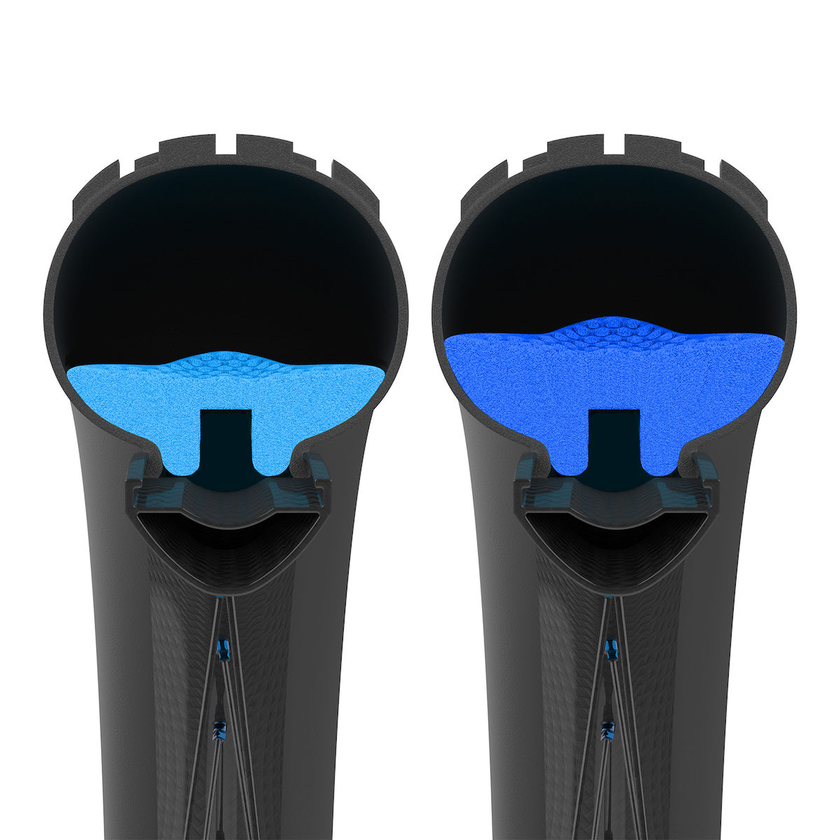 Die Formgebung der Kanäle sorgt für den sogenannten Venturi- oder Bodeneffekt. Die durch die Kanäle beschleunigte Luft im Reifeninneren verbleibt sehr viel länger zwischen Felgenbett und Reifeneinlage und minimiert somit effektiv den Rückpralleffekt - bei gleichzeitiger Erhöhung von Bodenhaftung sowie Stoßdämpfung! Das "Golfball-Design" der Oberfläche sowie die gewellte Form der Diamana-Reifeneinlage unterstützen diesen Effekt zusätzlich.