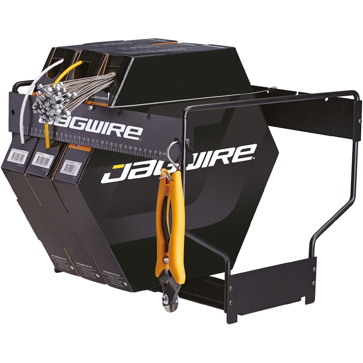 Das Umfallen und Verrutschen der Boxen ist mit seiner Hilfe Vergangenheit. Ist der Organizer nicht mit sechs Boxen voll bestückt, können diese fixiert und das Umfallen innerhalb des Organizers verhindert werden. Des Weiteren ist an der Vorderseite eine praktische Skala zum Abmessen der Hüllen und Leitungen. Um die JAGWIRE Werkzeuge immer griffbereit zu haben, können diese an der Vorderseite aufgehängt werden.