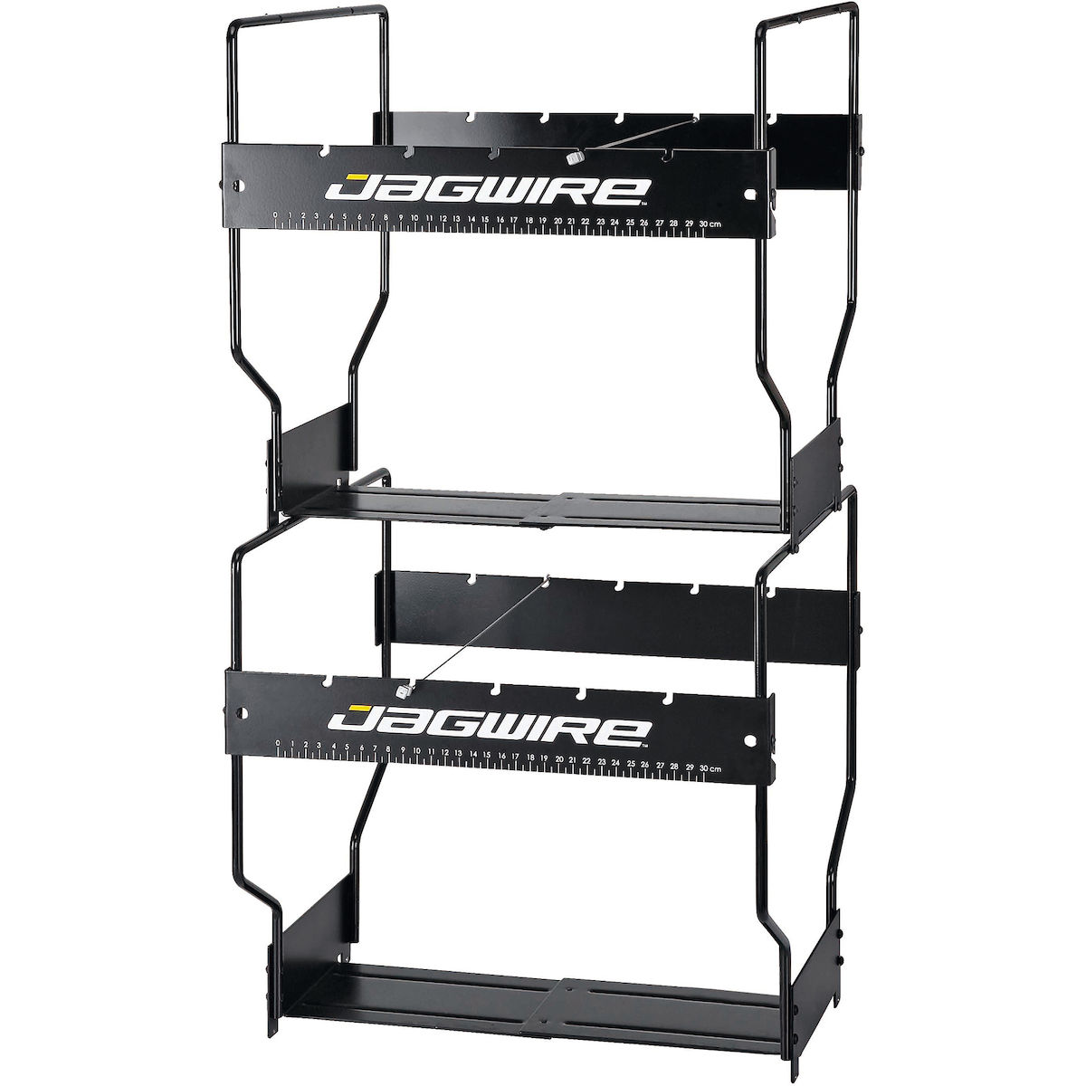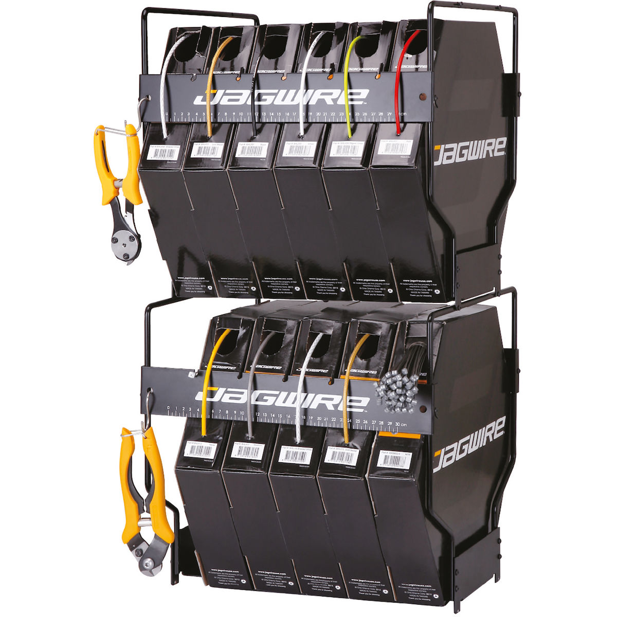 Das Umfallen und Verrutschen der Boxen ist mit seiner Hilfe Vergangenheit. Ist der Organizer nicht mit sechs Boxen voll bestückt, können diese fixiert und das Umfallen innerhalb des Organizers verhindert werden. Des Weiteren ist an der Vorderseite eine praktische Skala zum Abmessen der Hüllen und Leitungen. Um die JAGWIRE Werkzeuge immer griffbereit zu haben, können diese an der Vorderseite aufgehängt werden.